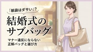 結婚式のサブバッグで「紙袋」はマナー違反!ダサくない正解は「サテン・レース素材のトートバッグ」です。100均での高見えアイテムの選び方や、会場でのスマートな振る舞いまで、大人の女性が知っておくべきマナーを完全解説します。