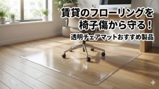 賃貸フローリングを椅子傷から守る透明チェアマットを紹介。キャスター傷は借主負担で修繕費5,000〜60,000円かかることも。ポリカーボネート製(5,000〜8,000円、10年耐久)とPVC製(3,000〜5,000円)を比較解説。厚み1.5mm以上、滑り止め加工付きを選ぶのがポイント。