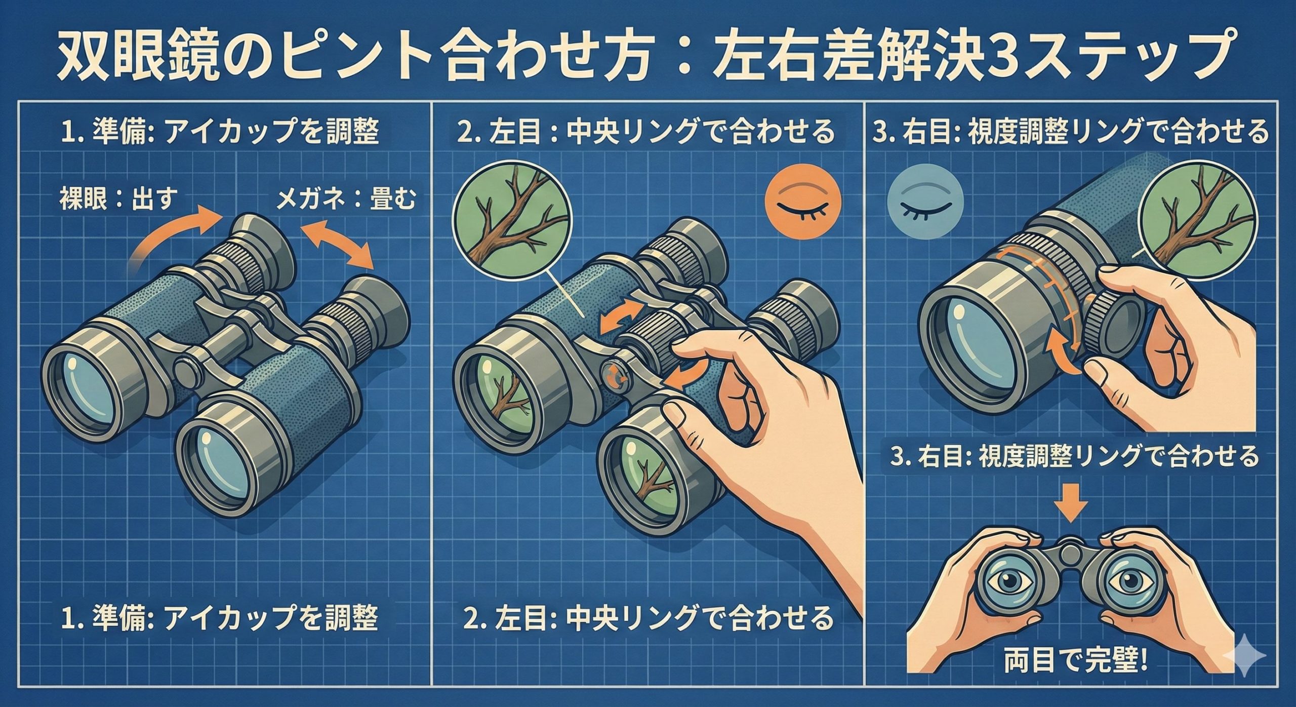 【図解】双眼鏡のピント合わせ方・基本の3ステップ