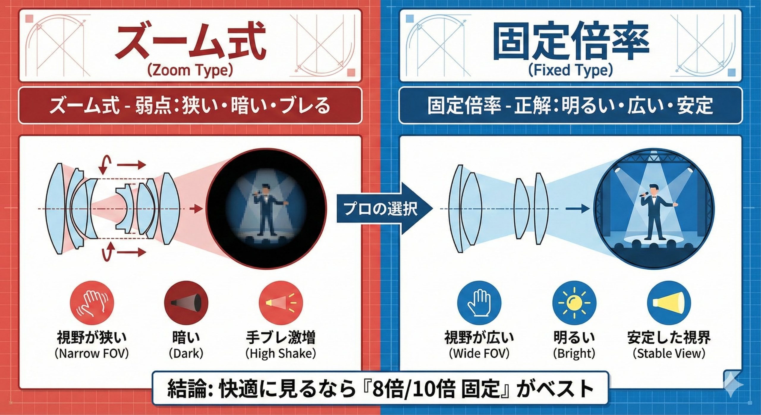 - ズーム式は「視野が狭い」「暗い」「手ブレする」という三重苦になりやすい。