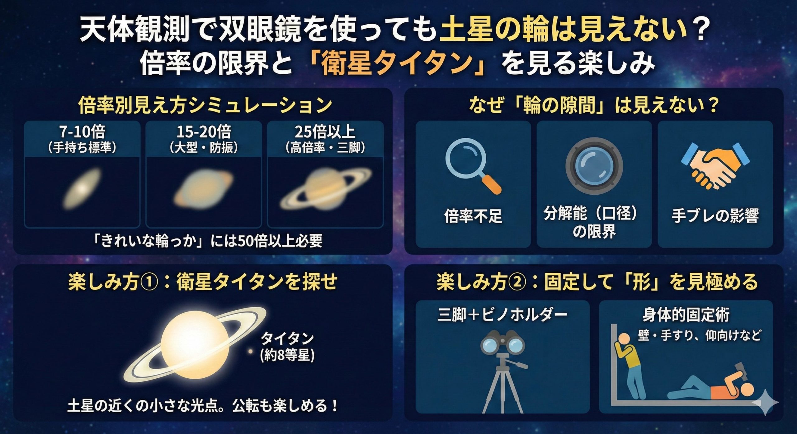 この記事では、双眼鏡の倍率ごとのリアルな見え方を解説した上で、輪が見えなくても楽しめる「衛星タイタン」の探し方や、手持ち機材で限界まで解像度を上げるテクニックを紹介します。