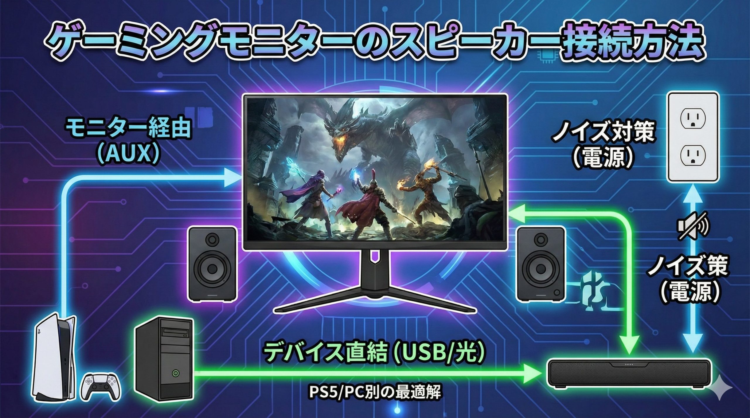 スピーカーの接続ルートは、大きく分けて「モニターを経由させる」か「デバイスから直接音をとる」かの2択です。それぞれのメリットとデメリットを理解して、自分に合った方法を選びましょう。