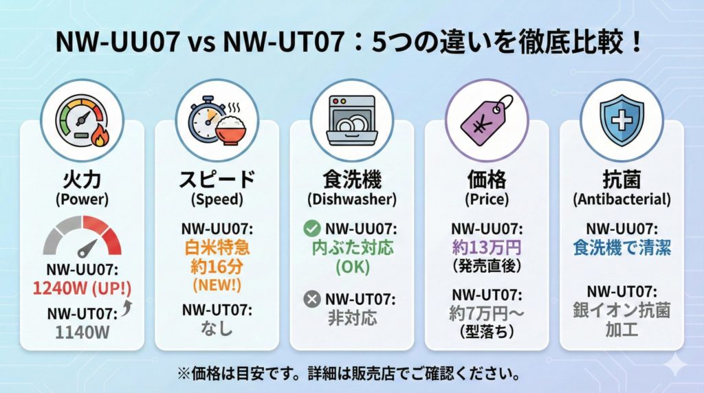 最新モデルNW-UU07と旧型NW-UT07には、日々の生活を変える大きな違いが5つございます。特にパワーアップした火力と時短機能は見逃せないポイントです。