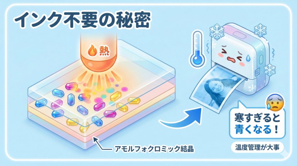 この結晶は、温度と加熱時間によって色が変わり、一般的に「低温かつ長い加熱」でシアン(青色)が発色するように設計されています。そのため、冬場や寒い部屋でプリンター本体が冷え切っていると、熱制御がうまくいかず、意図せずシアンが強く反応してしまい、写真全体が青被りしてしまうのです。