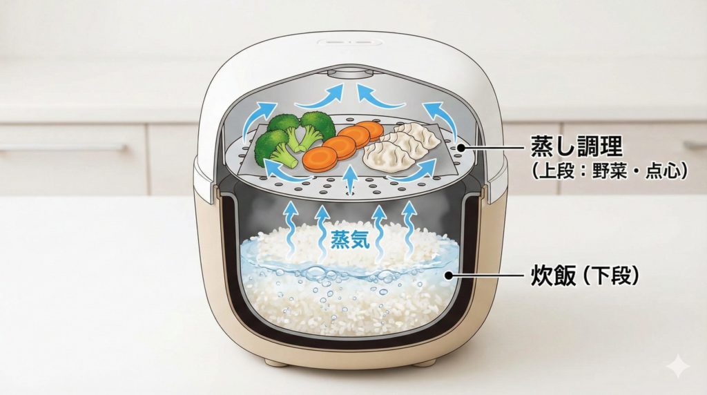 下段でお米を炊きながら、上段で蒸し料理ができるアレです。